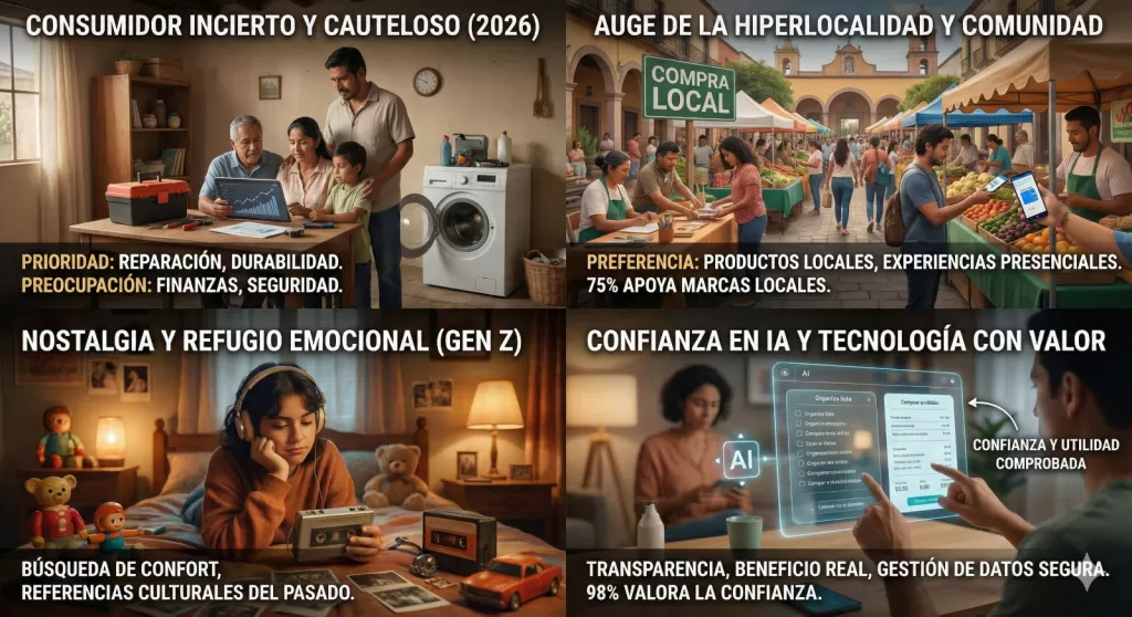Las cuatro tendencias clave que moldearán al consumidor mexicano en 2026: del optimismo cauteloso a la incertidumbre, de lo sostenible a lo comunitario, del autocuidado a la nostalgia y de la curiosidad por la IA a la búsqueda de confianza.