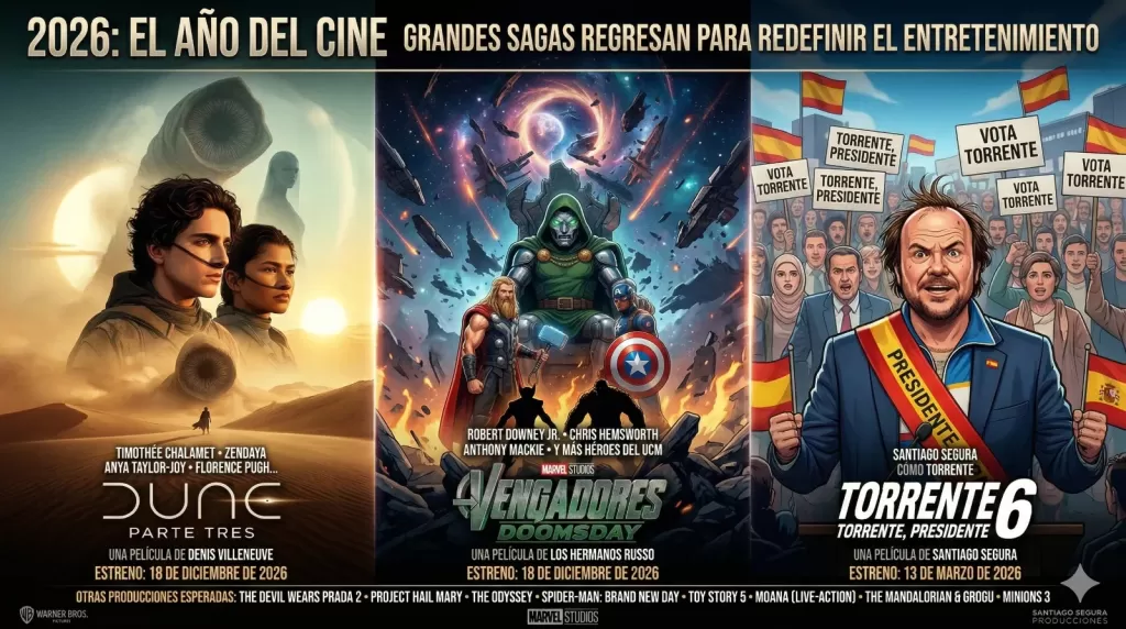 Descubre las películas más esperadas de 2026, incluyendo 'Dune 3', 'Vengadores Doomsday' con Robert Downey Jr. como Doctor Doom, y 'Torrente 6'. Un año cargado de épicas secuelas y nuevos universos cinematográficos que no te puedes perder.
