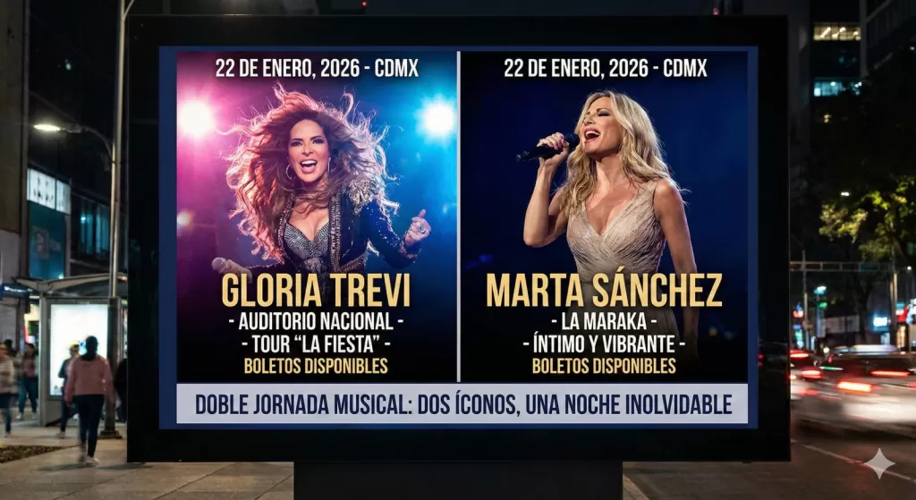 La Ciudad de México se prepara para una doble jornada musical de alto impacto este jueves 22 de enero de 2026, con dos figuras prominentes de la música hispana ofreciendo espectáculos simultáneos. Gloria Trevi se presentará en el icónico Auditorio Nacional, mientras que Marta Sánchez hará lo propio en el íntimo escenario de La Maraka, prometiendo noches memorables para sus respectivos públicos. Ambos eventos, confirmados y con boletos aún disponibles a través de canales oficiales, marcan un hito en la agenda cultural de la capital mexicana.