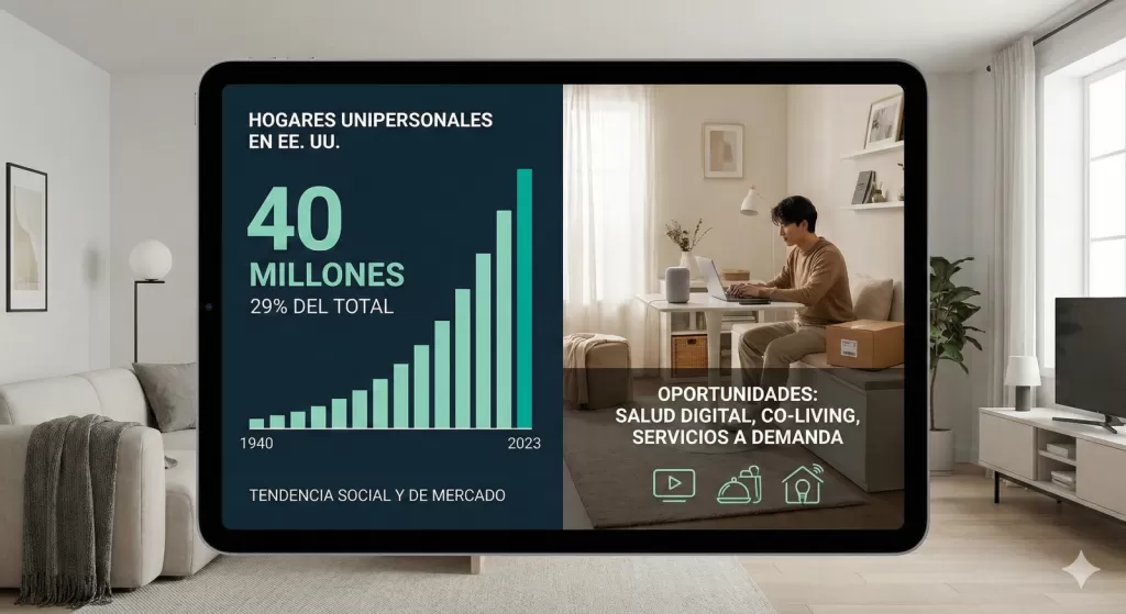 Una nueva era demográfica emerge en EE. UU. con 40 millones de personas en hogares unipersonales, redefiniendo el consumo. Descubre las profundas implicaciones para el mercado inmobiliario, tecnológico y de servicios a nivel internacional.