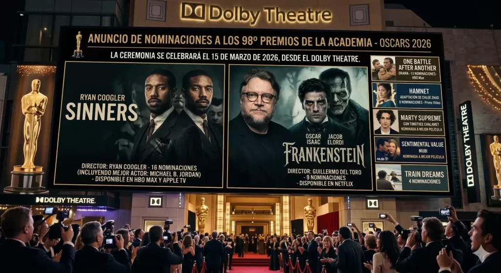 Descubre la guía completa de películas nominadas a los Oscar 2026: 'Sinners' lidera con 16 nominaciones y 'Frankenstein' de Guillermo del Toro destaca. Conoce dónde ver estos filmes a nivel global y en México.