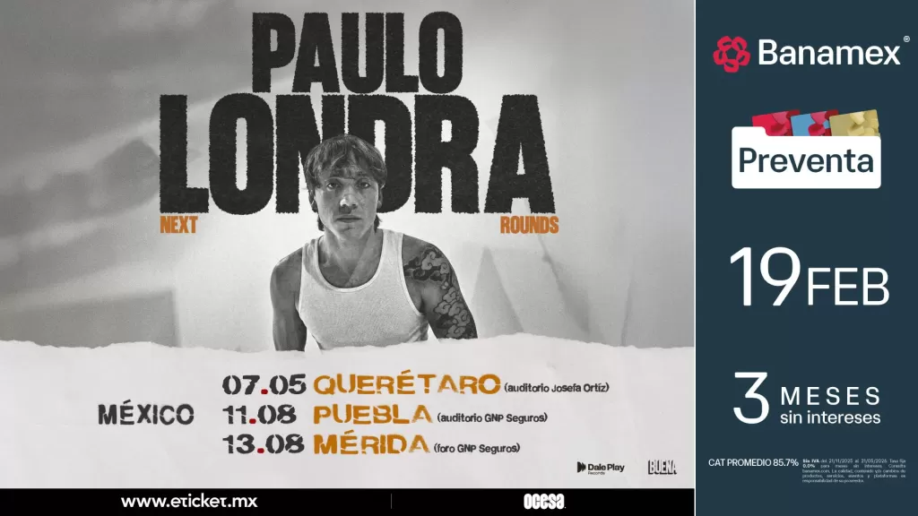 Paulo Londra anuncia su regreso a México con tres conciertos en Querétaro, Puebla y Mérida. La preventa Banamex inicia el 19 de febrero de 2026, seguida de la venta general el 20 de febrero. ¡No te pierdas la gira 'Next Rounds'!