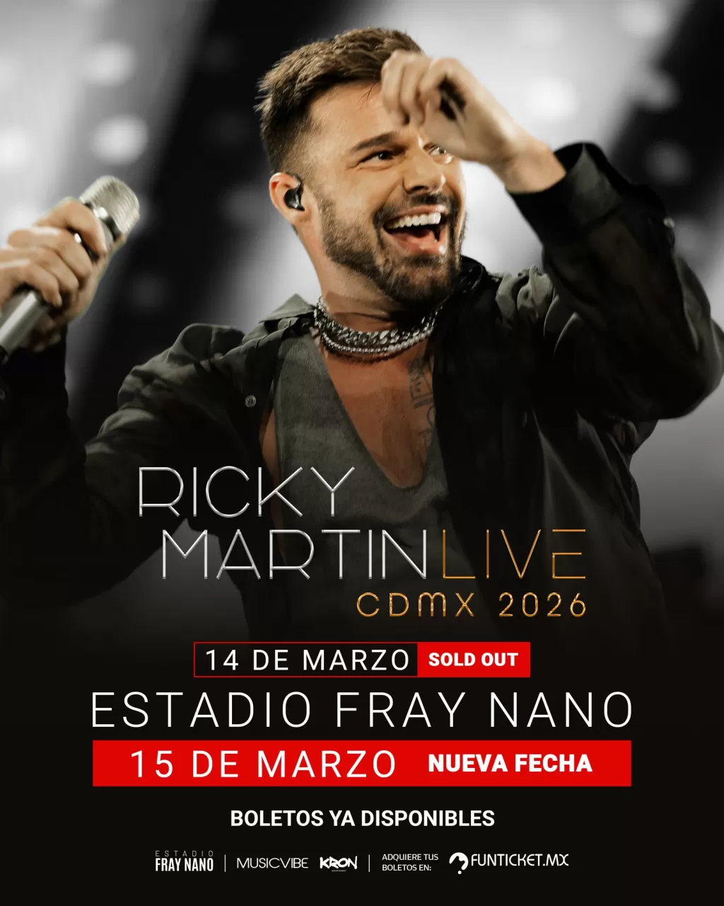 Ricky Martin añade una segunda fecha a su gira 'Ricky Martin Live México 2026' en el Estadio Fray Nano de CDMX el 15 de marzo de 2026, tras agotar entradas. Los boletos para el nuevo show estuvieron disponibles desde el 19 de febrero.